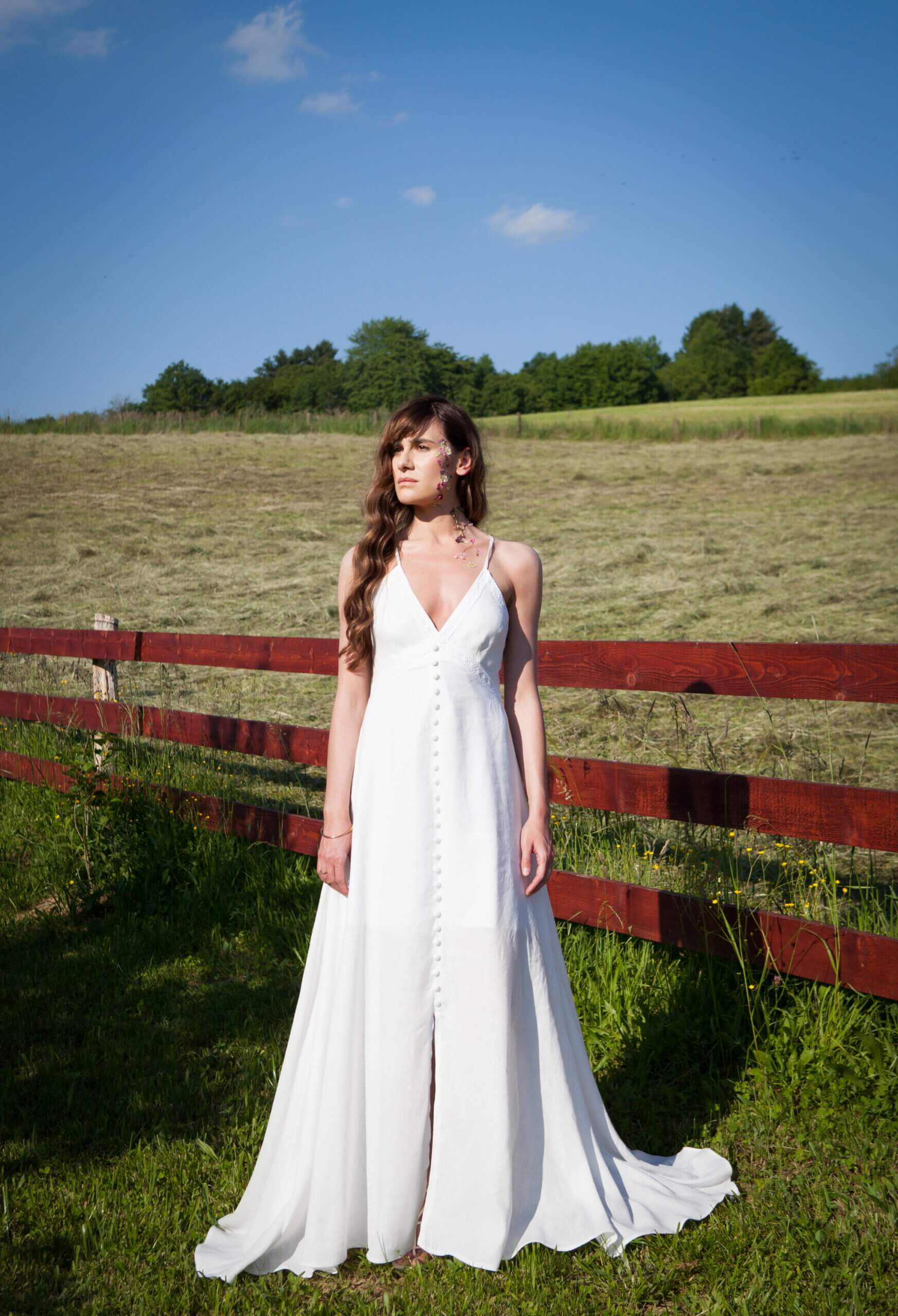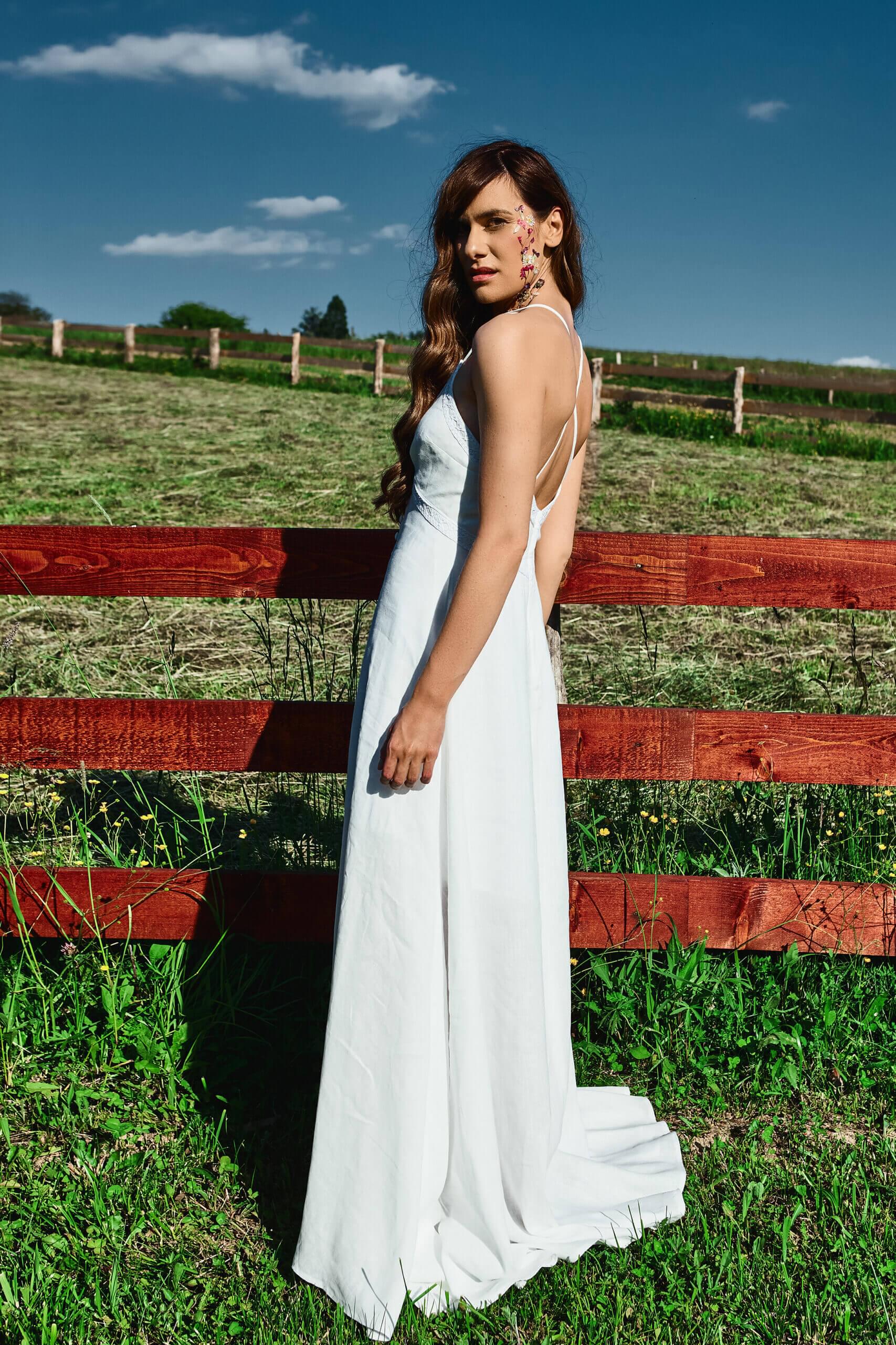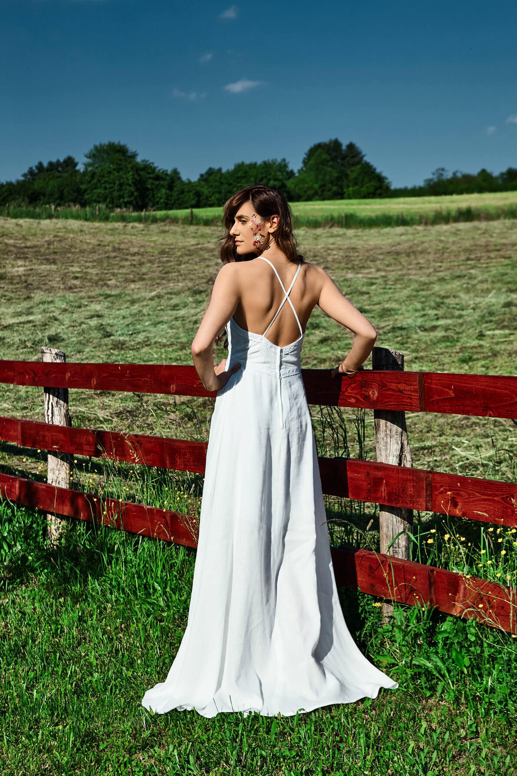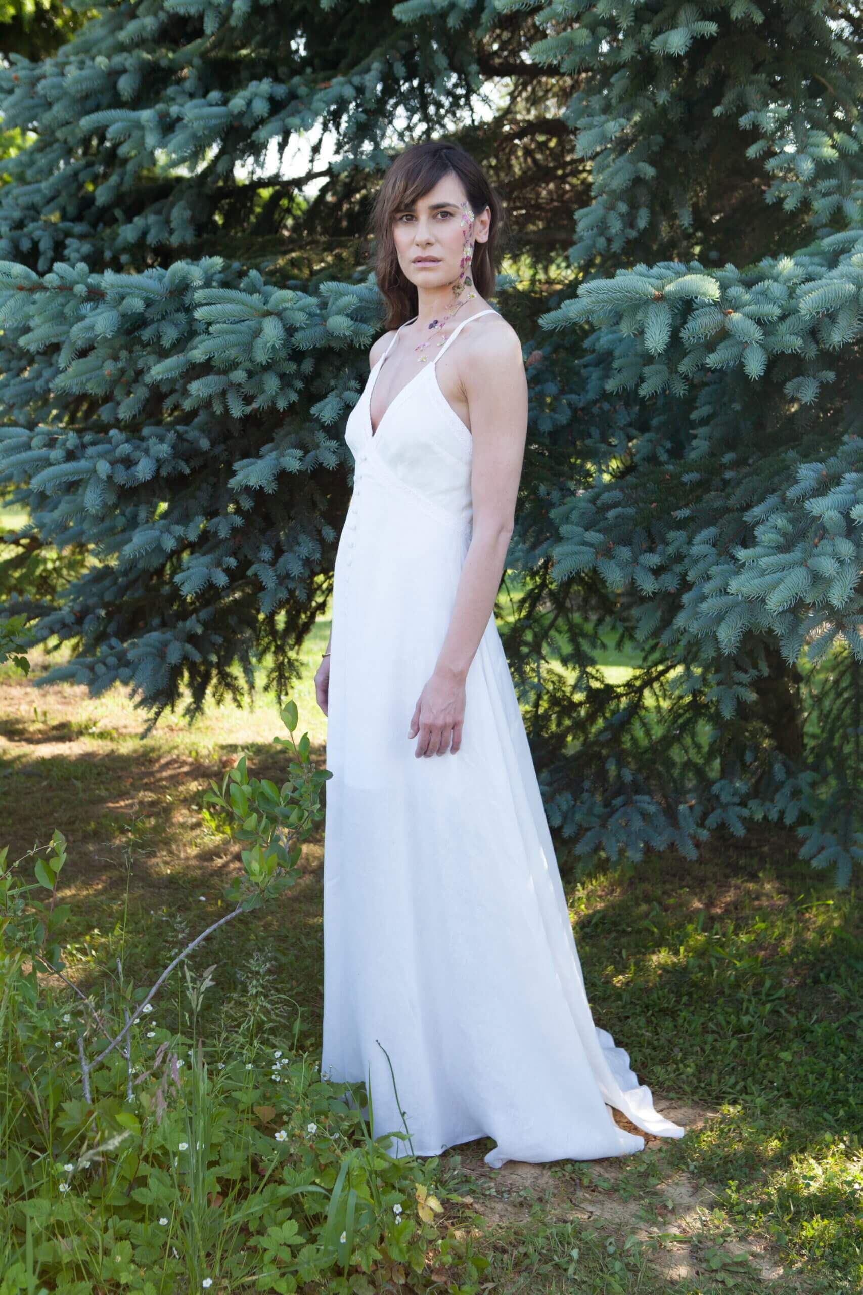 A long linen dress that spreads towards the bottom. It has a deep V neckline which is decorated with handmade lace. Prednja strana ukrašena je i manjim presvučenim okruglim gumbima. Leđa su otvorena ukrašena ručno rađenom čipkom i tankim u križ naramenicama. The zip is on the back.