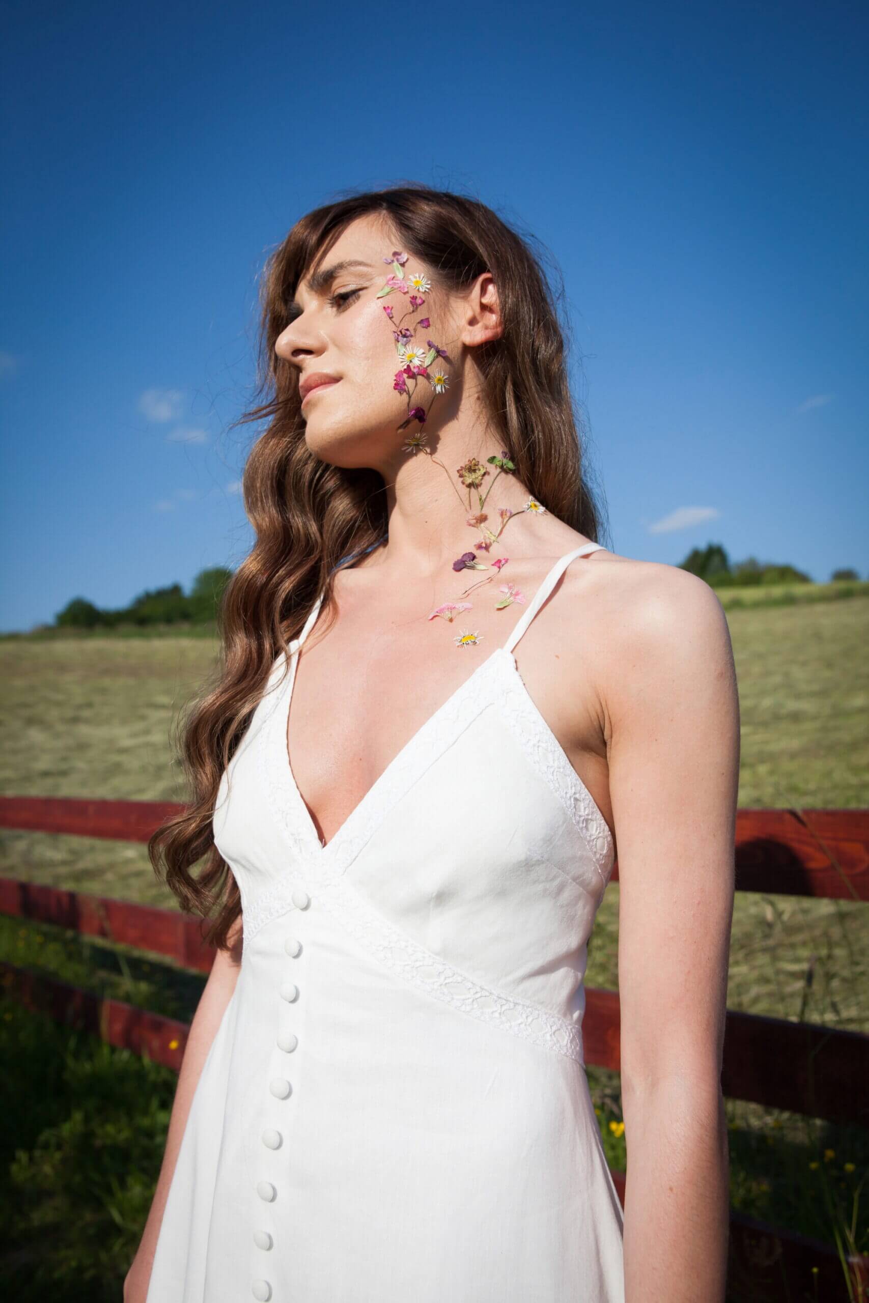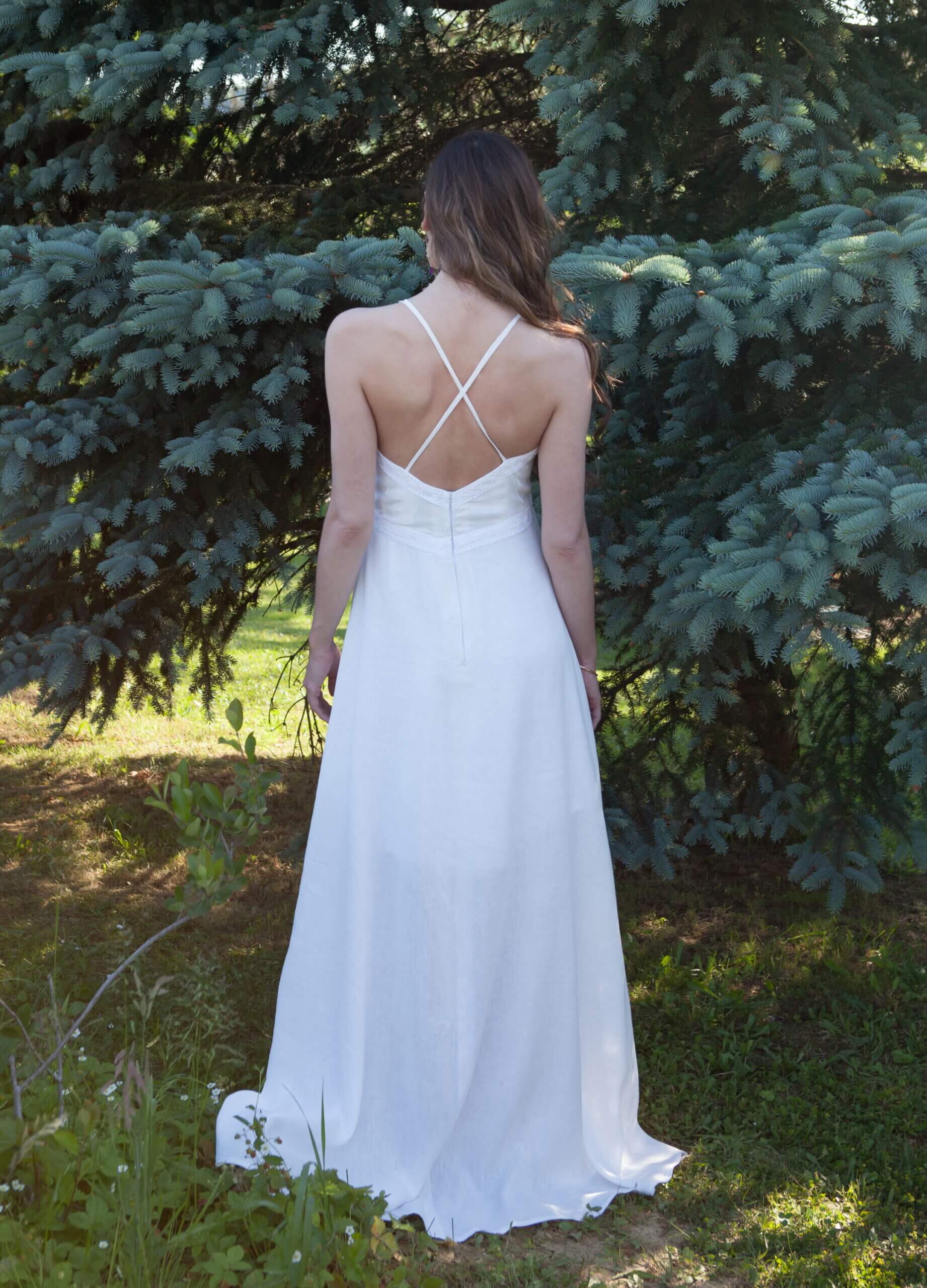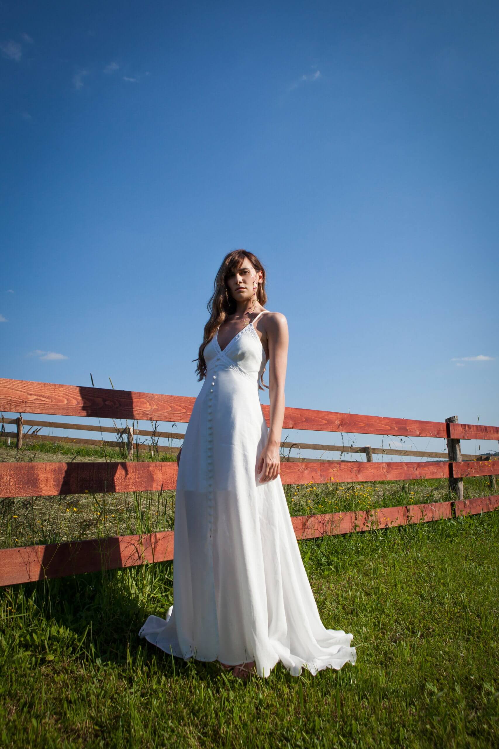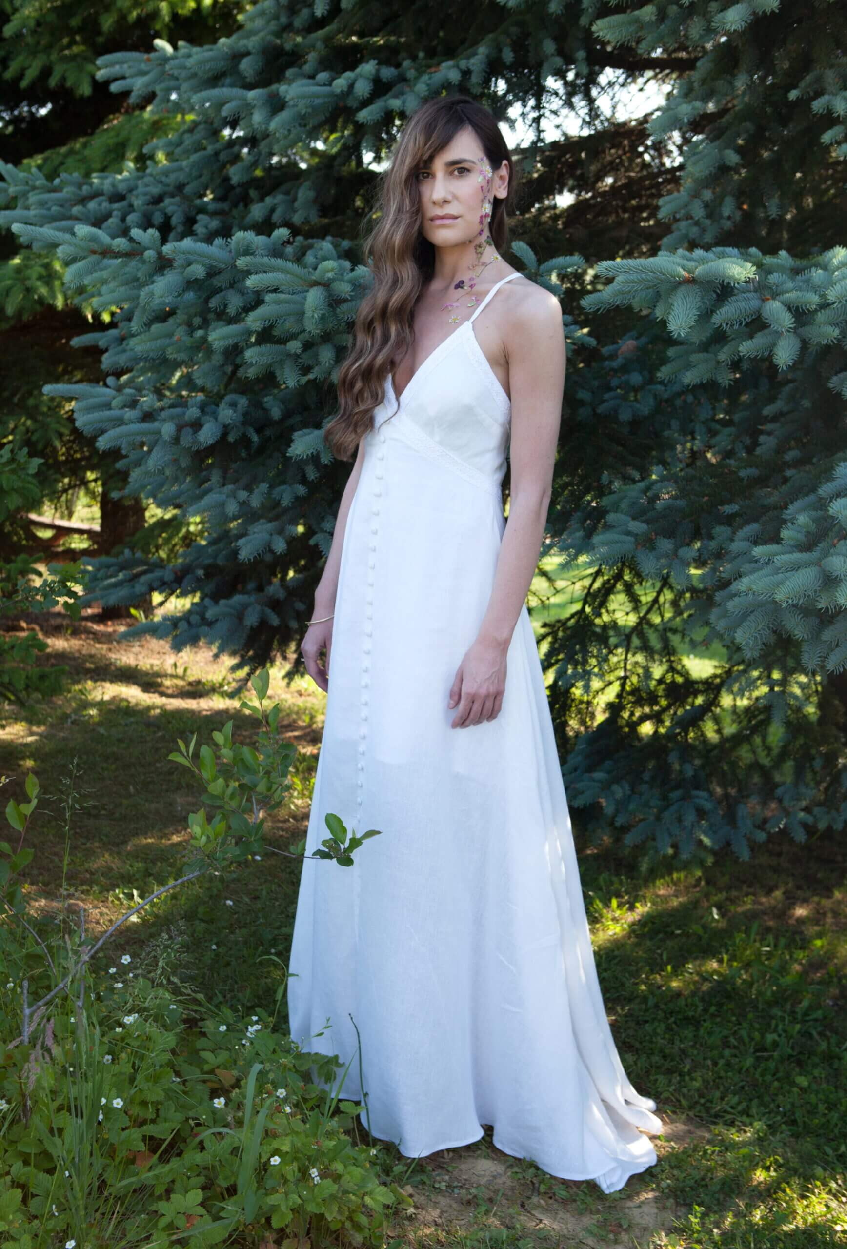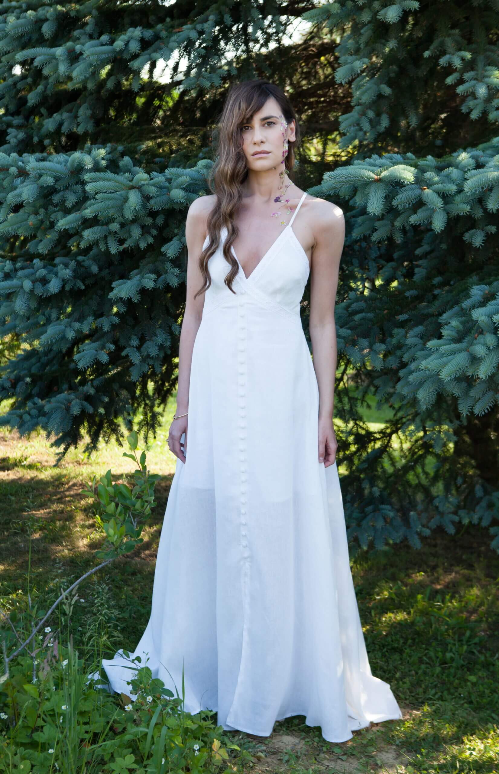 A long linen dress that spreads towards the bottom. It has a deep V neckline which is decorated with handmade lace. Prednja strana ukrašena je i manjim presvučenim okruglim gumbima. Leđa su otvorena ukrašena ručno rađenom čipkom i tankim u križ naramenicama. The zip is on the back.
