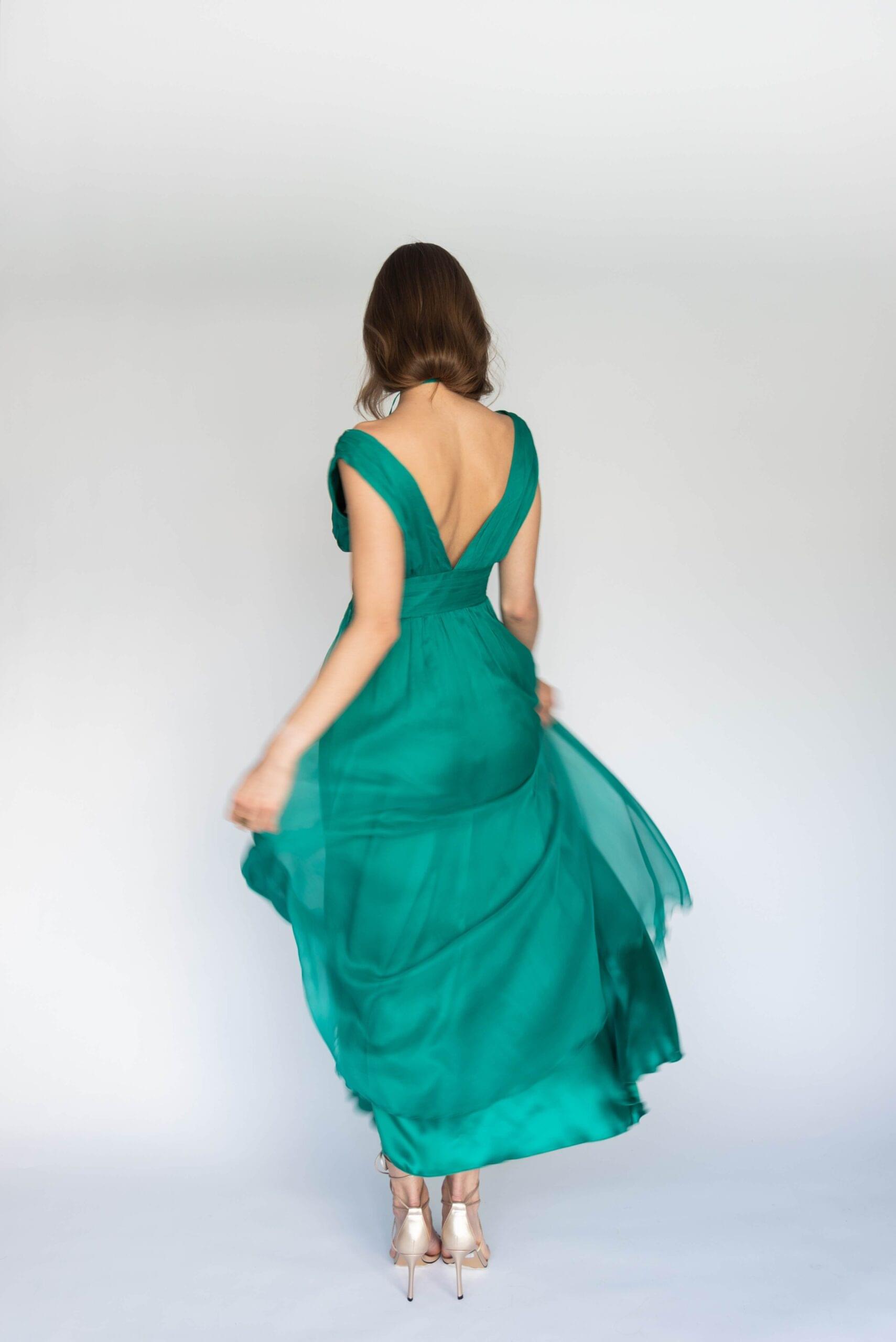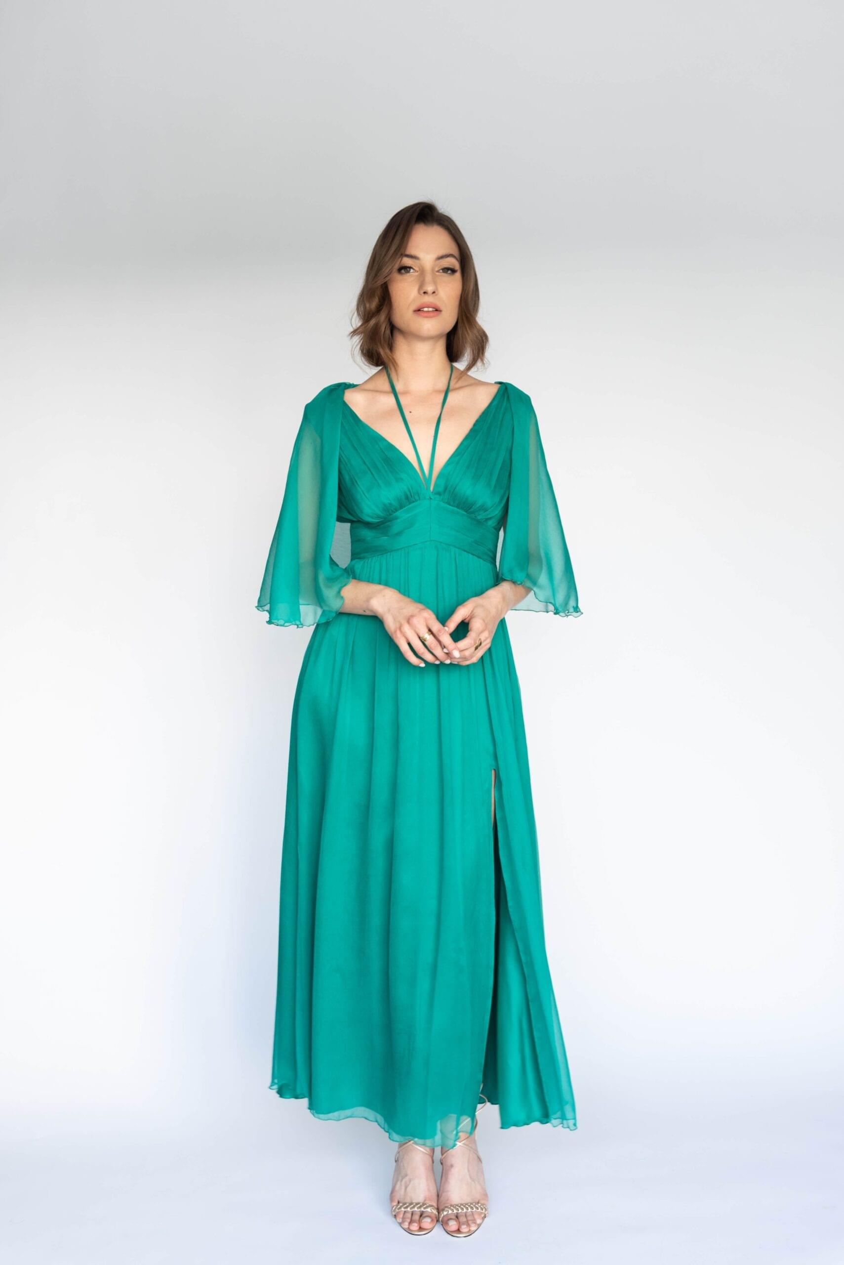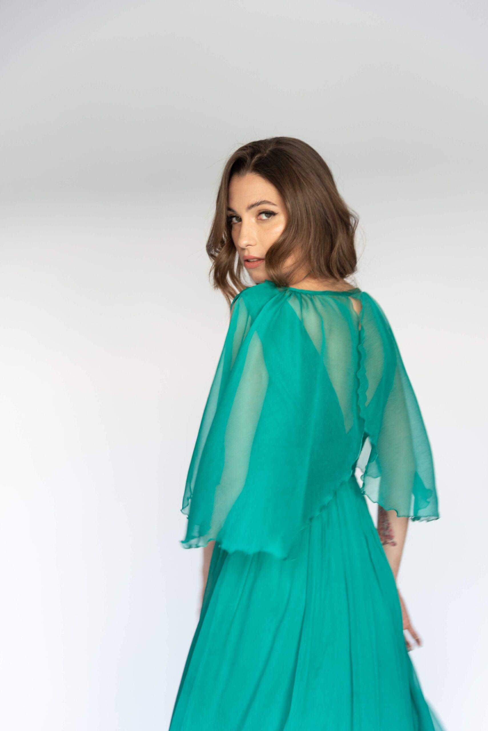 Duga bogata lepršava svilena haljina sa pelerinom koja se može skinuti.
