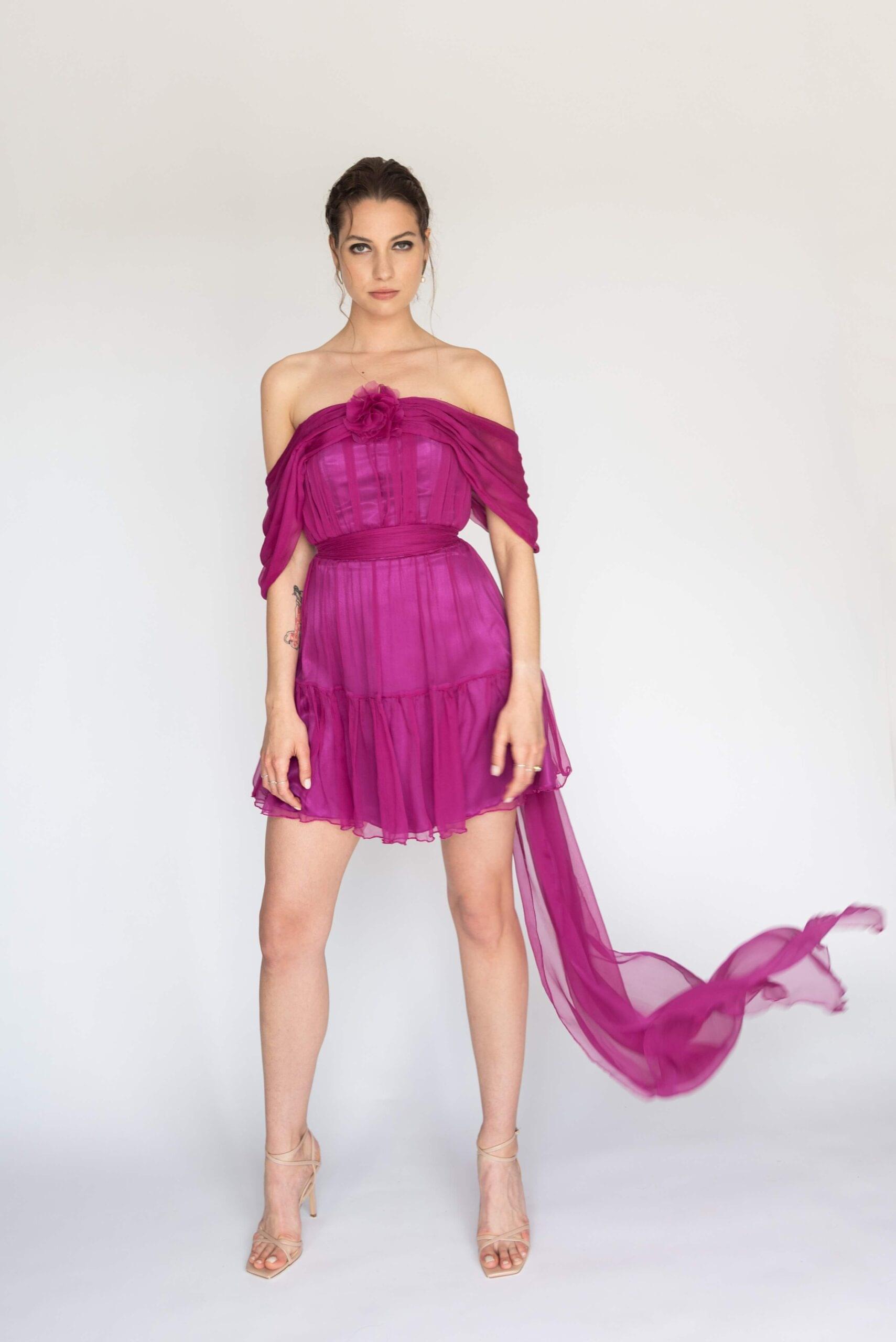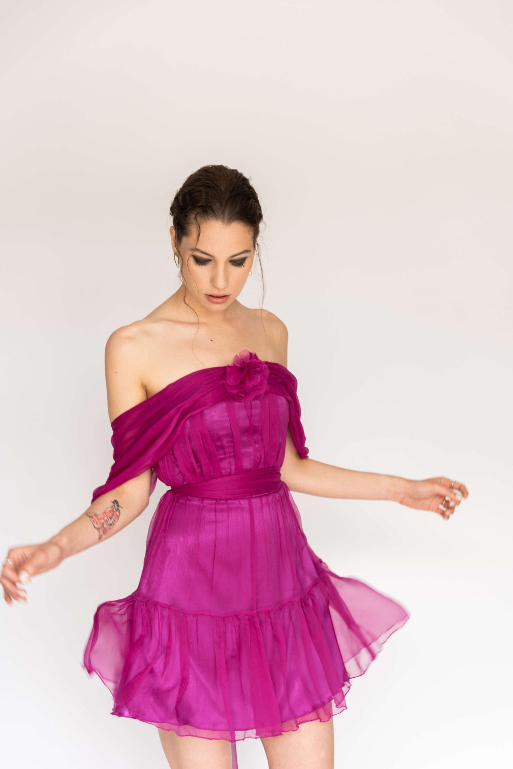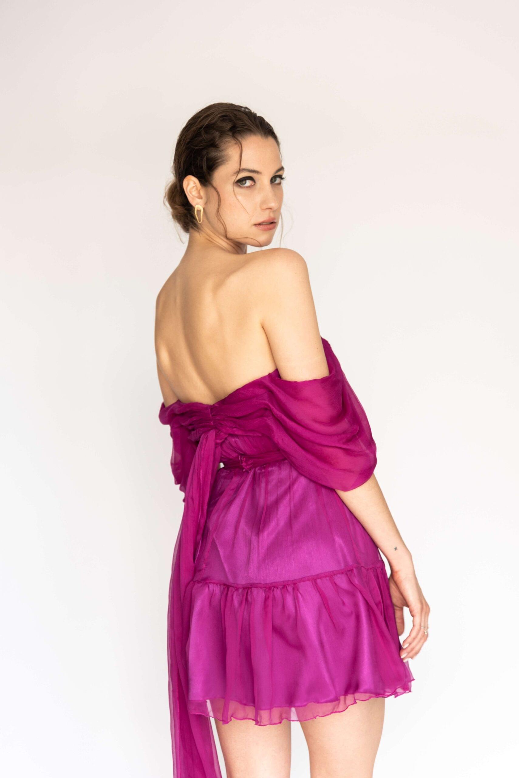 Mini svilena ciklama haljina sa volanom, spuštenim bogatim ramenima i mašnom. Gornji dio haljine je korzetiran da bi što bolje pritajao. Savršena za izlaske i svečane prilike. Moguća izrada u drugim bojama.