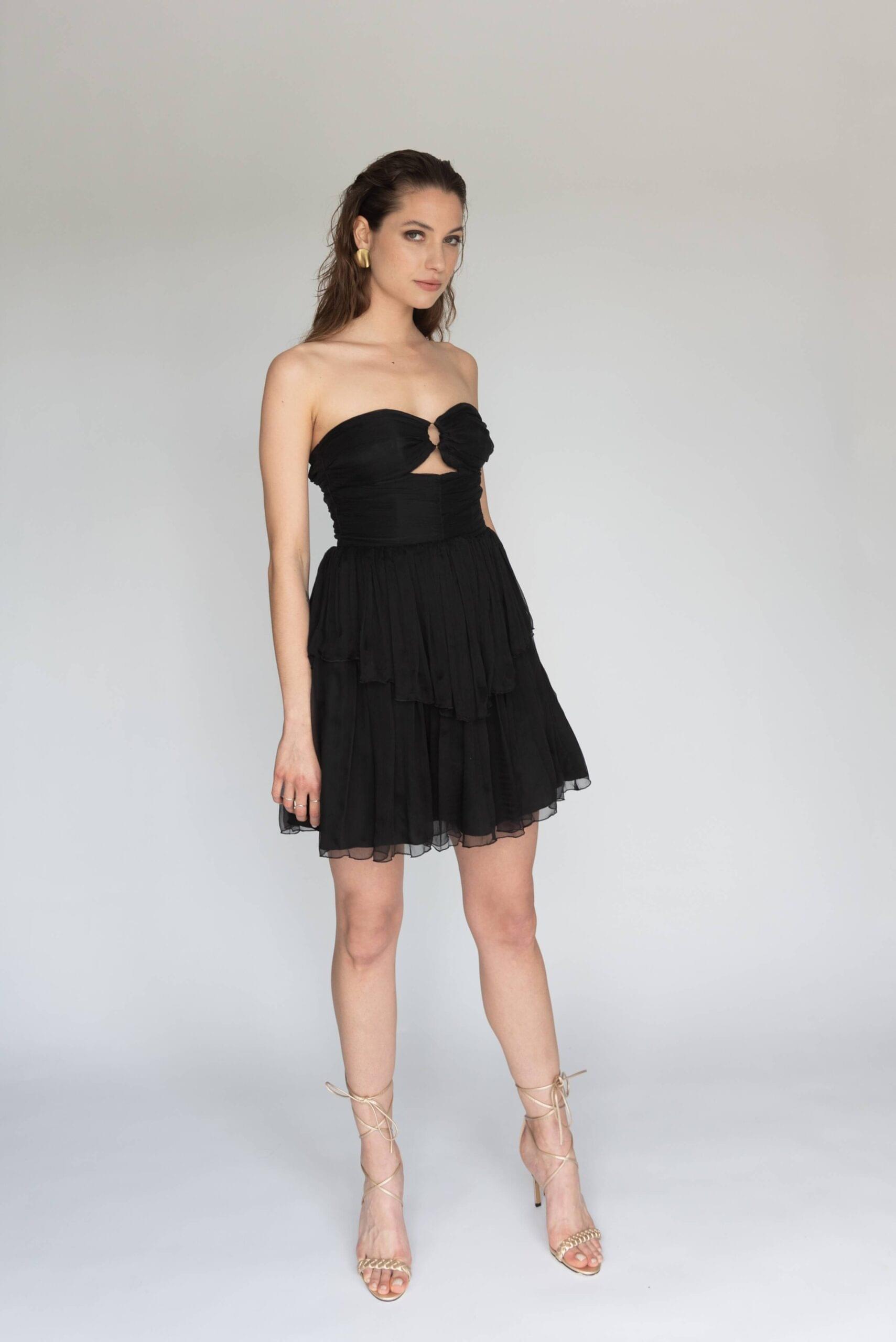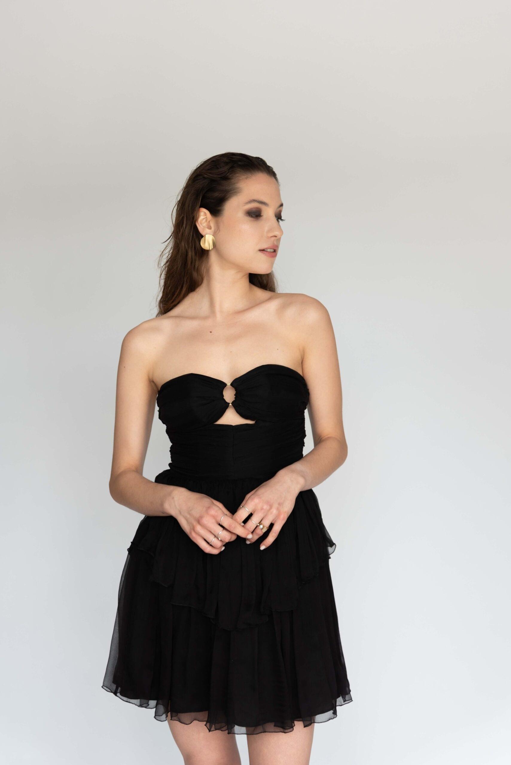 Crna mini haljina sa volanima. Ukrašena ručno izrađenim mjedenim ringom. Gornji dio je korzetiran da bi haljina što bolje pristajala. Žniranje na leđima.