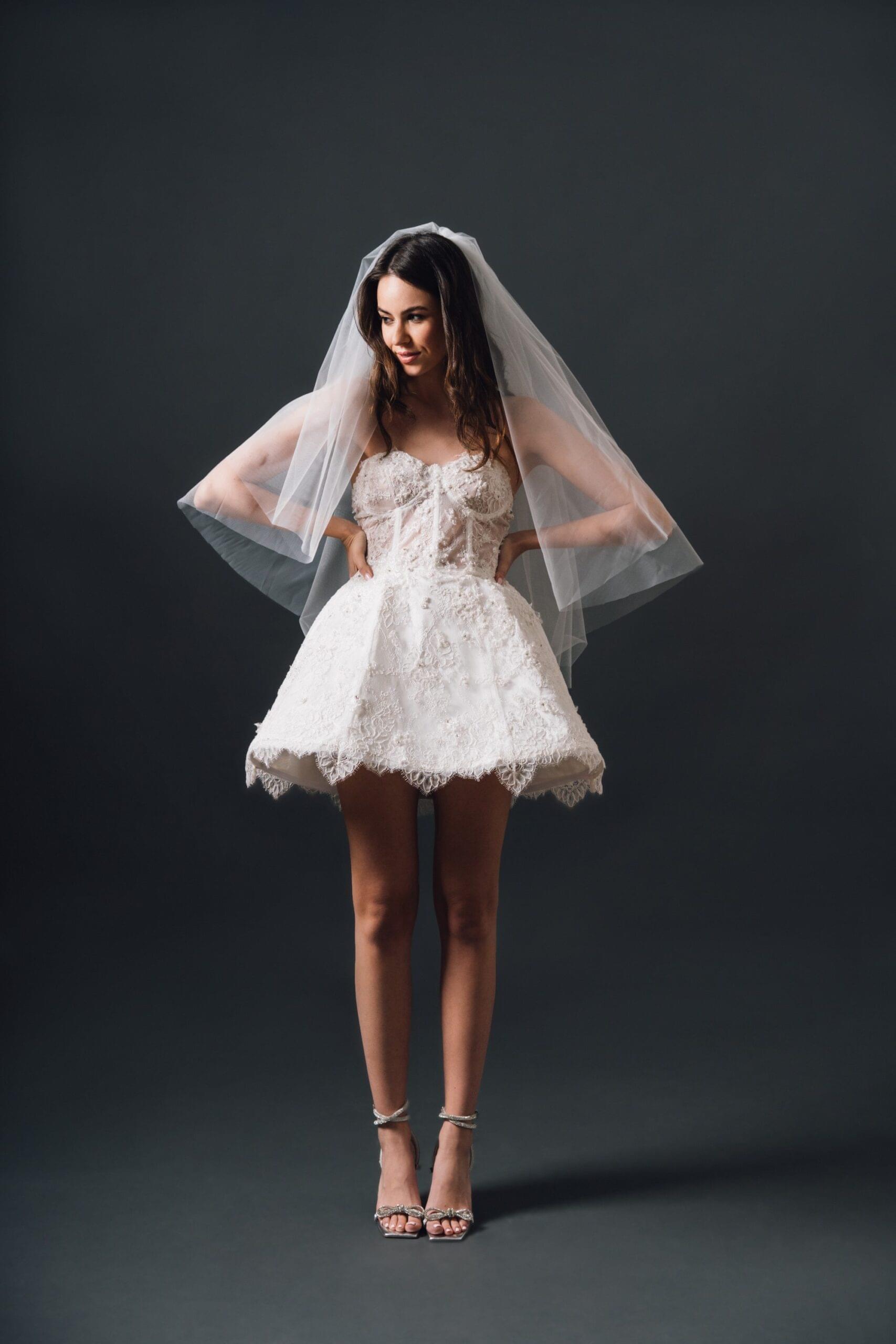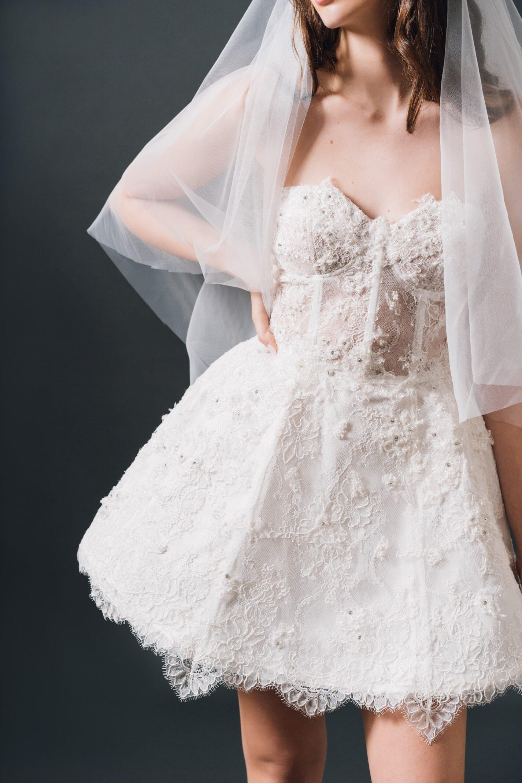 Mini vjenčanica LARA savršena je haljina za ples i zabavu nakon svadbene ceremonije. Korzetirana čipkana mini haljina ručno je ukrašena šljokičastim cvijetnim motivima.