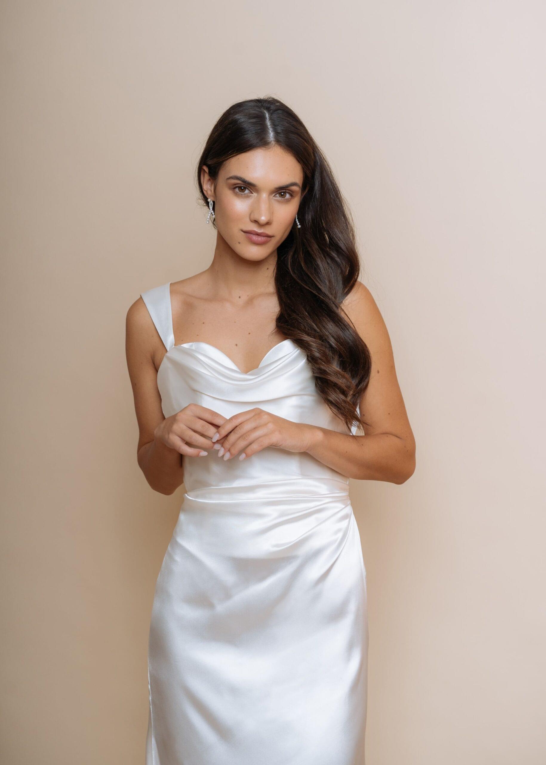 Naramenice vjenčanice moguće je nositi spuštene ili podignute. Visoki sjaj svilenog materijala u kombinaciji sa čipkom na leđima i šlepu naglašavaju posebnost I ženstvenost ove vjenčanice.