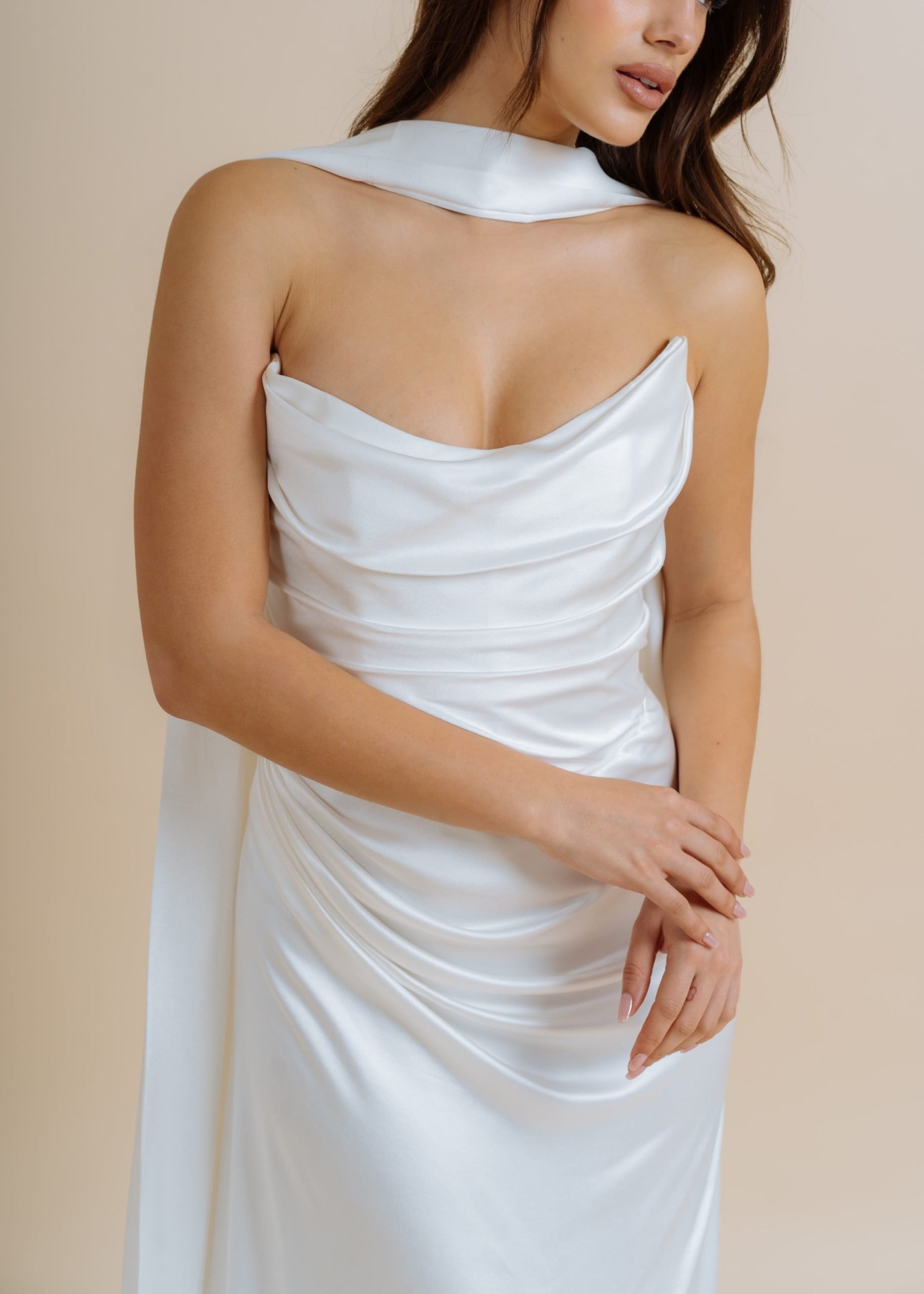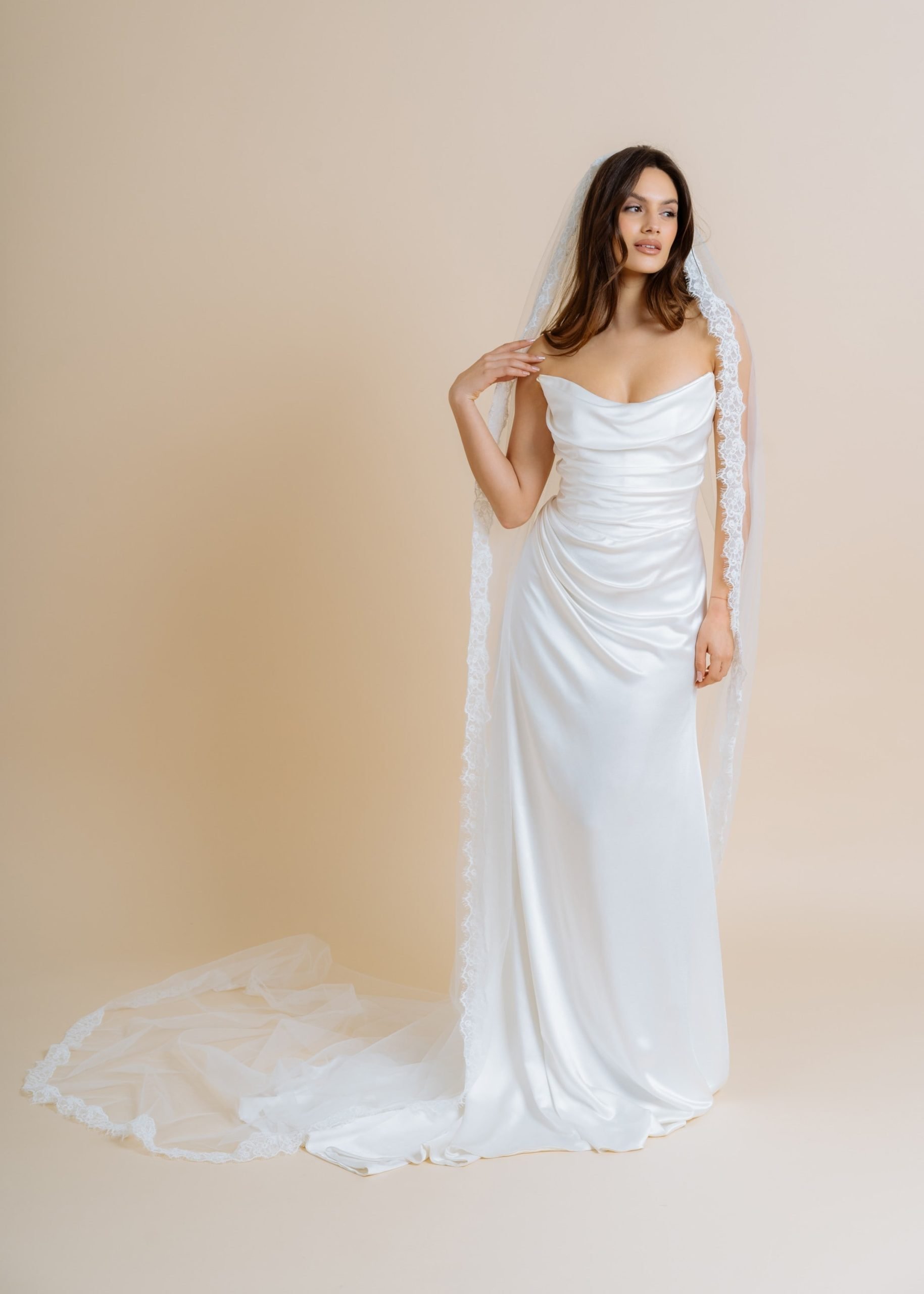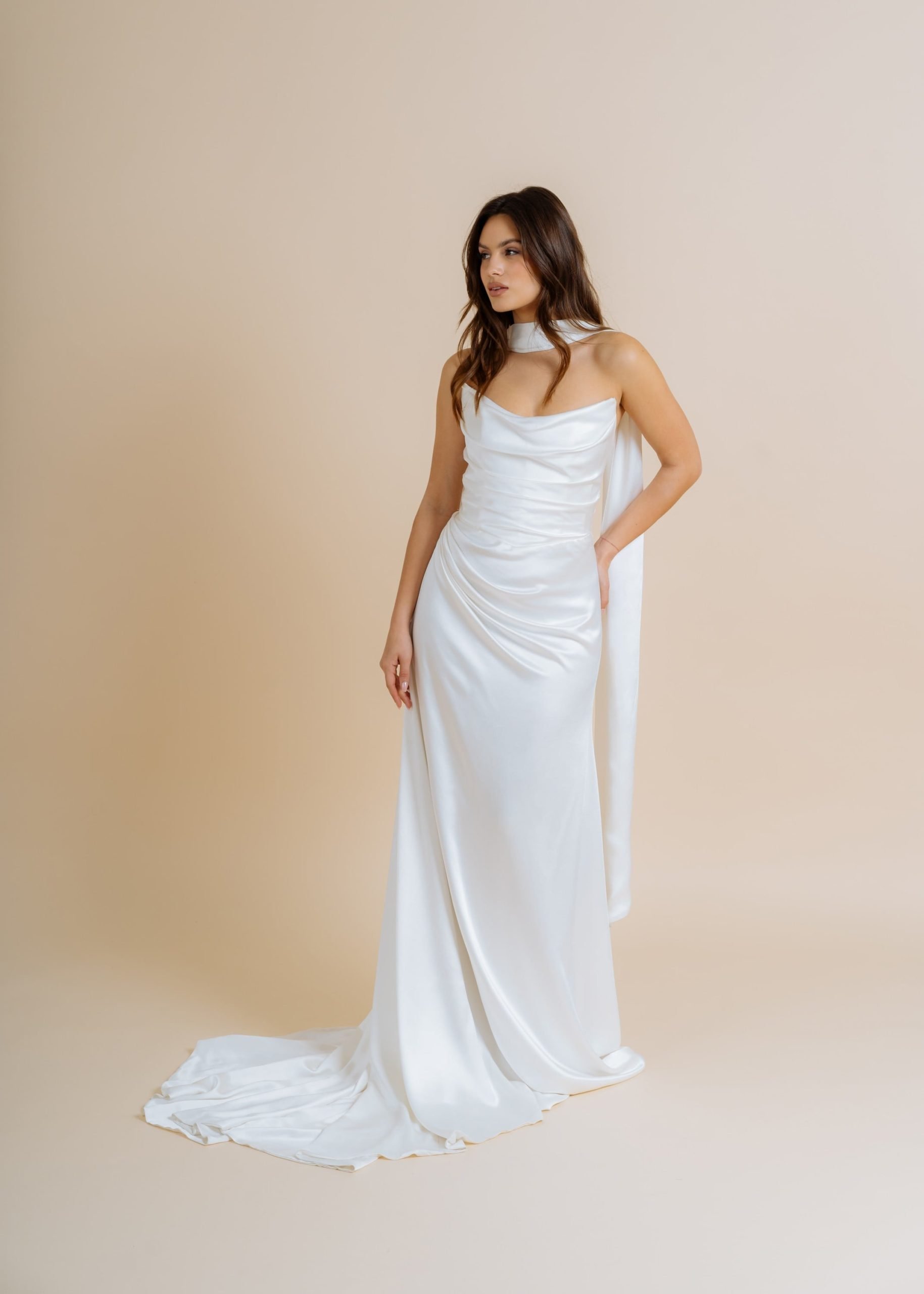 Elegantna i atraktivna vjenčanica Venus odličan je izbor za mladenke koje žele izgledati moderno i ženstveno. Drapirani korzet i skladni donji dio vjenčanice naglašavaju ženstvenu figuru. Dugi šlep i lagani sjaj prirodnog materijala upotpunjuju bezvremenski izgled vjenčanice.