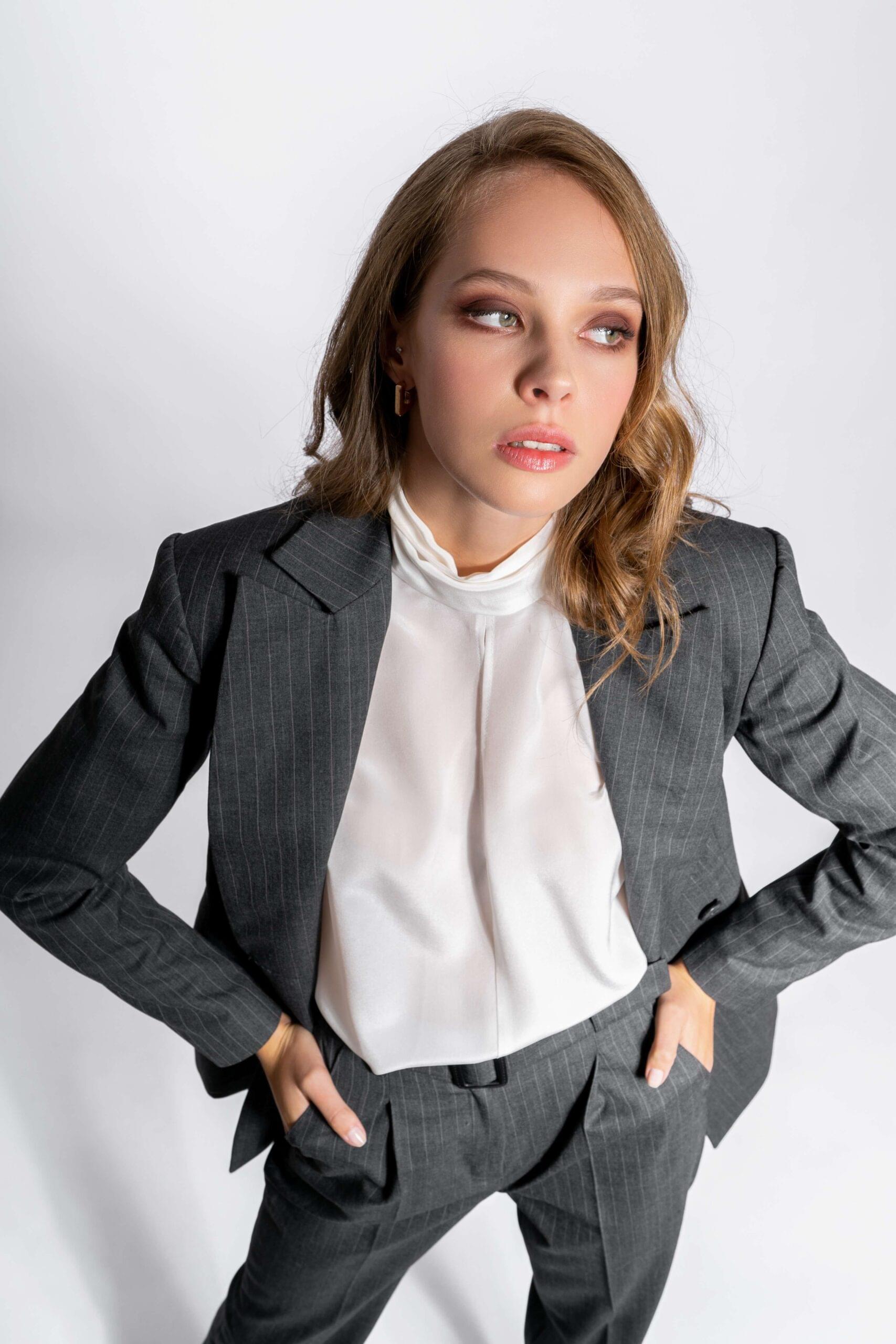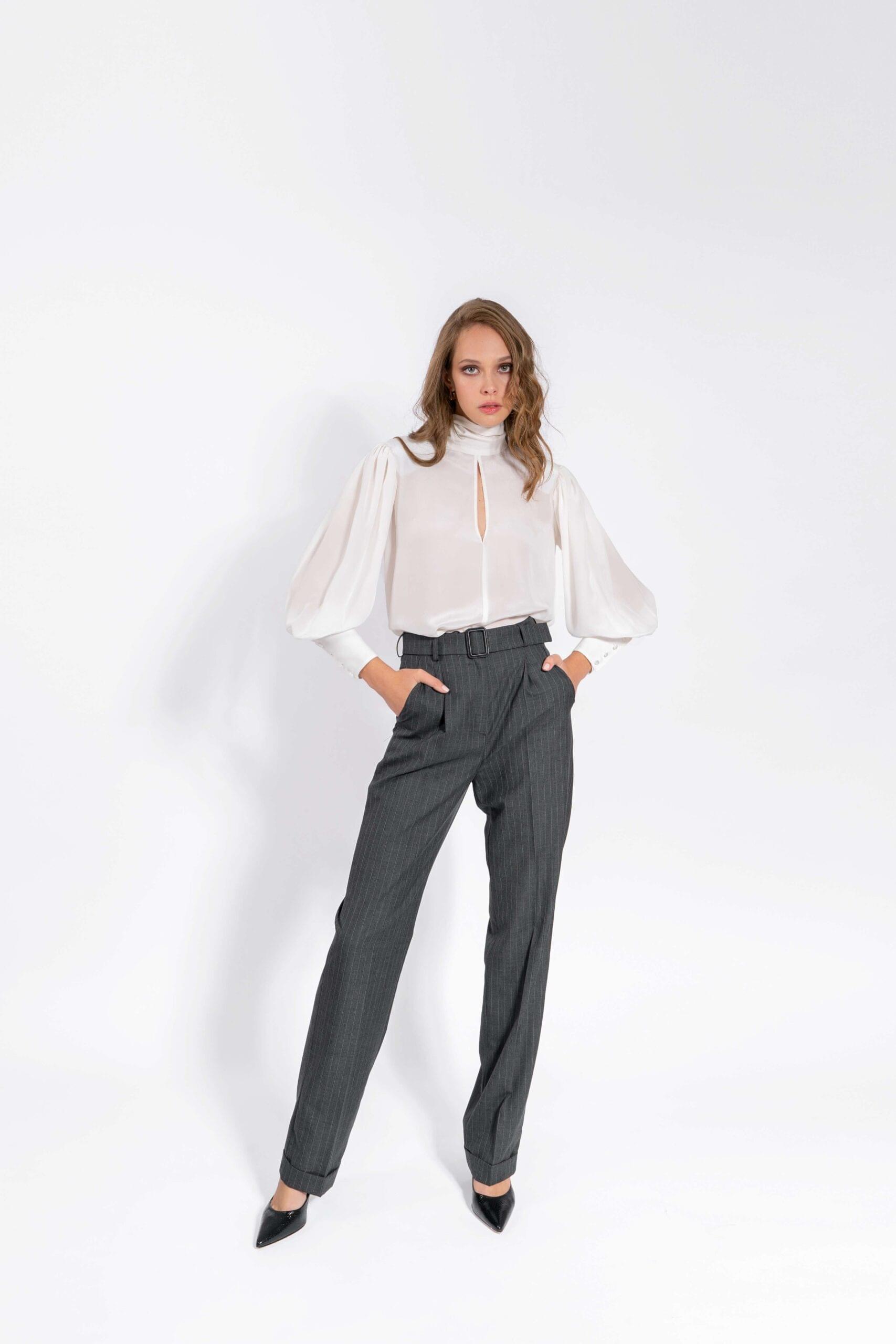 Bijela svilena bluza opuštenog kroja sa prorezom i ovratnikom koji se veže oko vrata. Bluza ima duge puf rukave sa višom manžetom. Savršeno se uklapa u odjevne kombinacije za poslovne prilike.