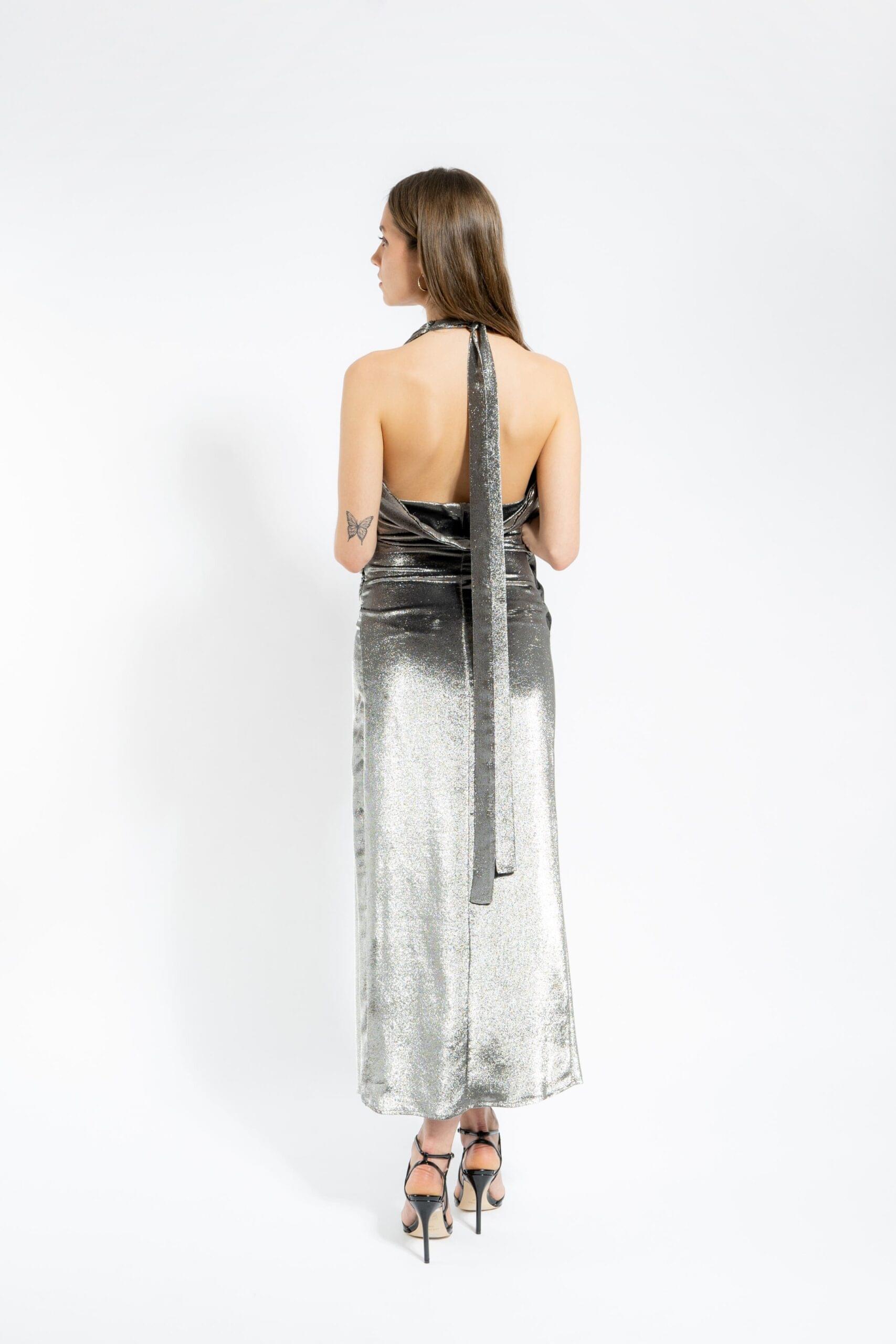 Midi srebrena metalizirana svilena dekoltirana haljina sa vezanjem oko vrata. Haljina je elegantno nabrana te ima prorez sa prednje strane. Ukrašena je svilenim metaliziranim ružicama. Vrlo zavodljiva haljina savršena je za izlaske i svečane prilike.