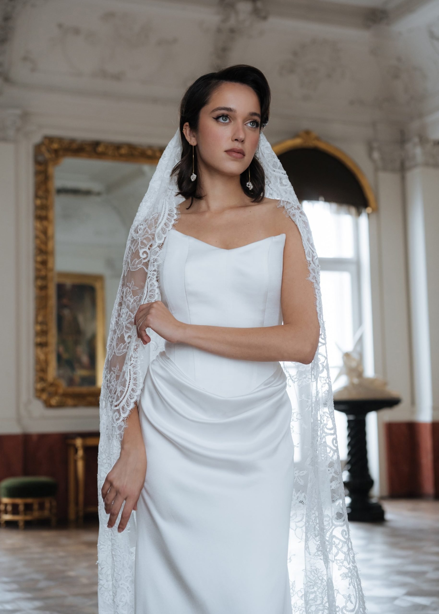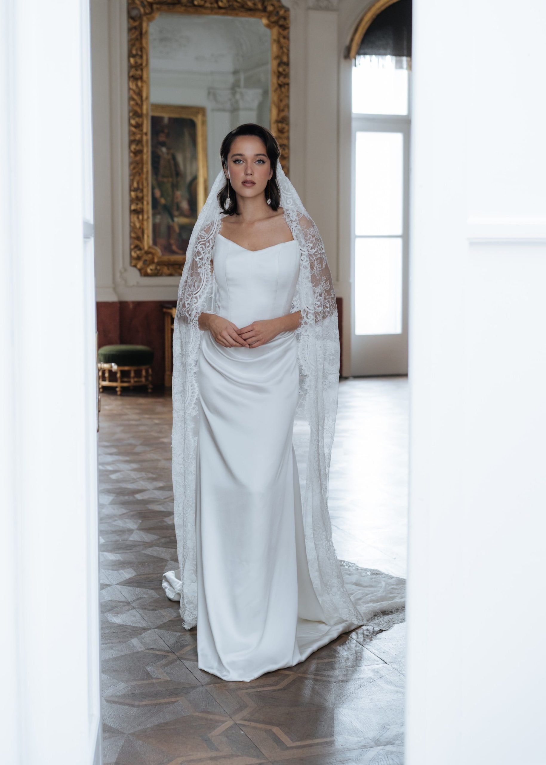 Sirena kroj i strukturirani korzet vjenčanice naglašavaju ženstvenu figuru. Dugi šlep upotpunjuje bezvremenski izgled vjenčanice.