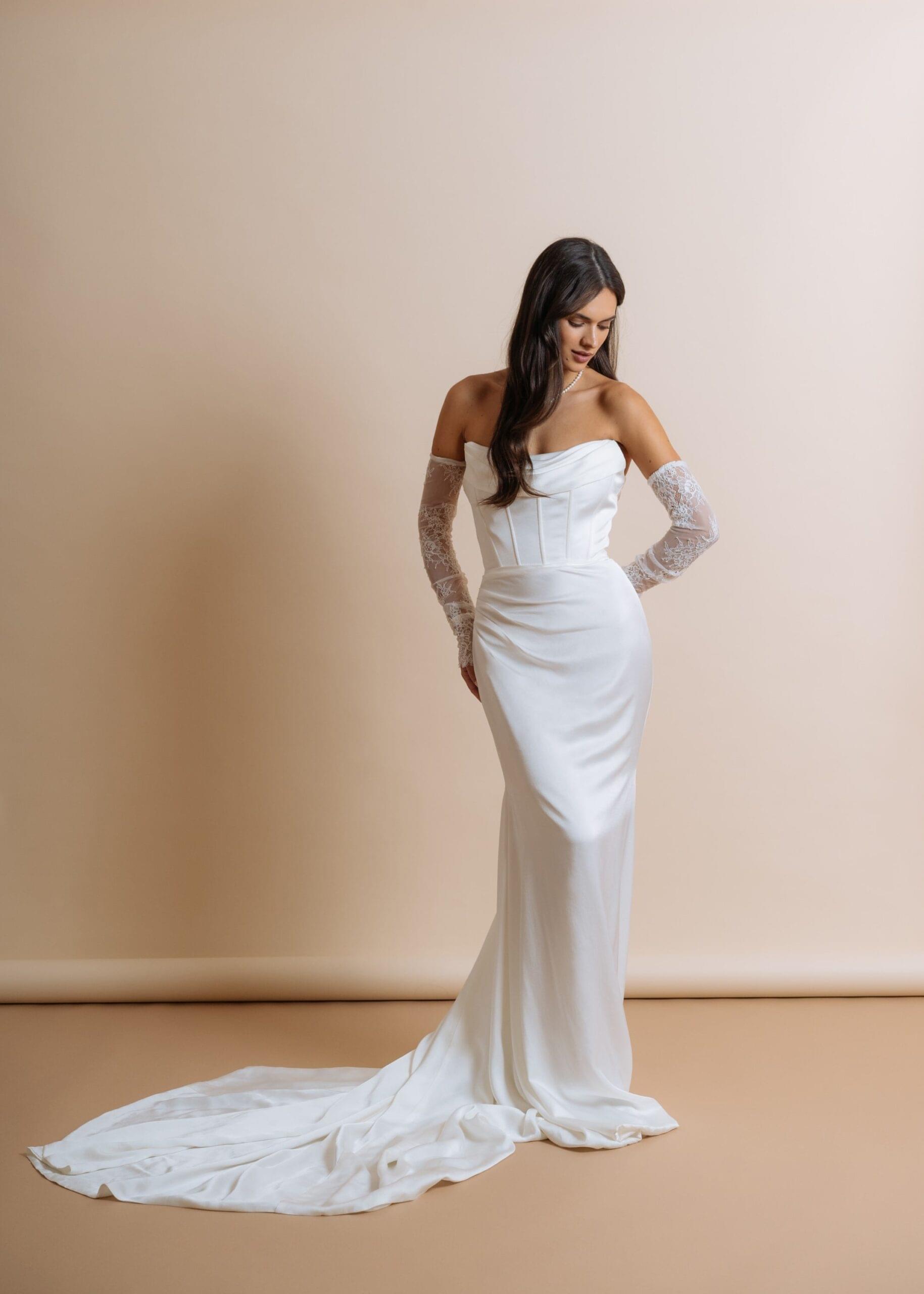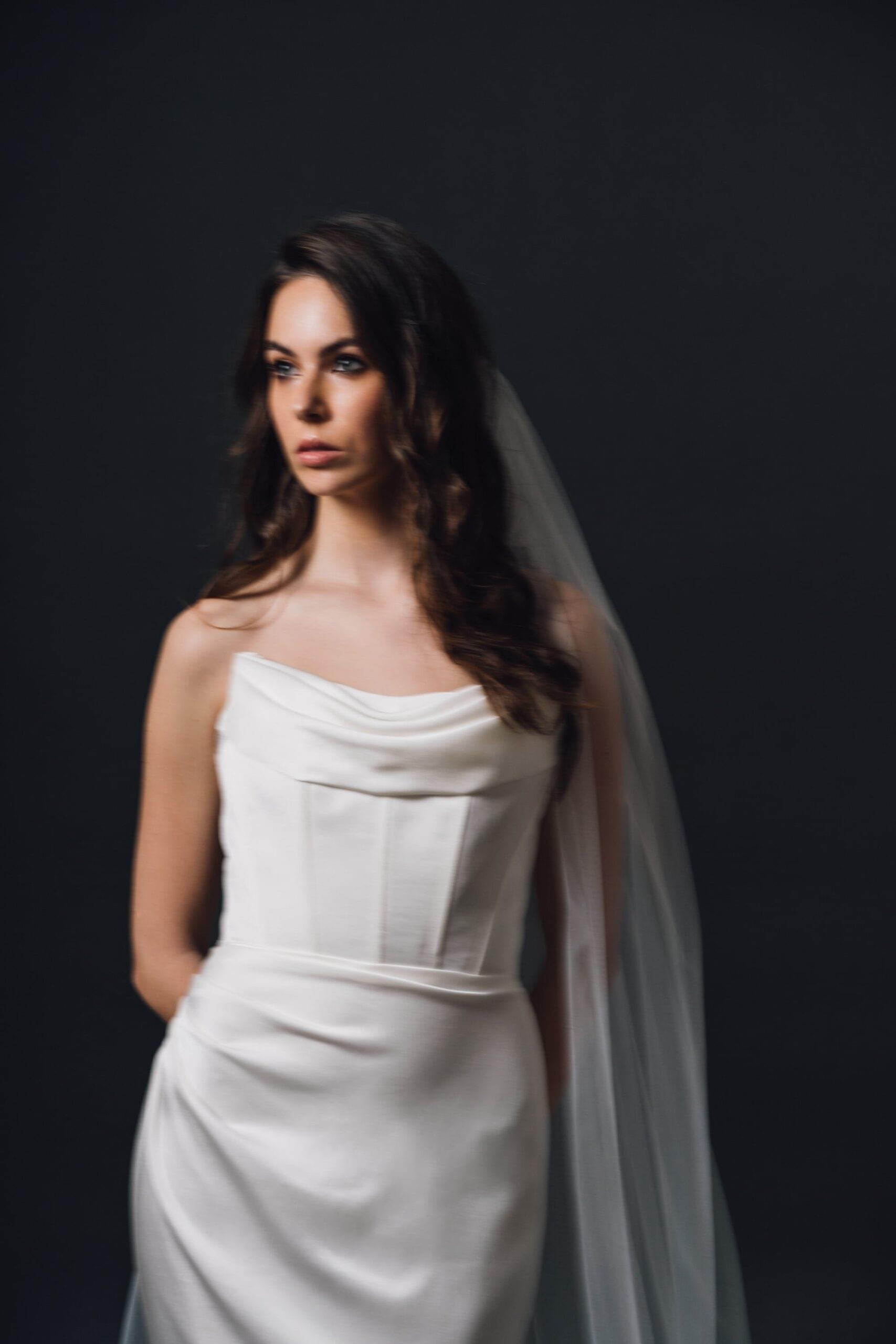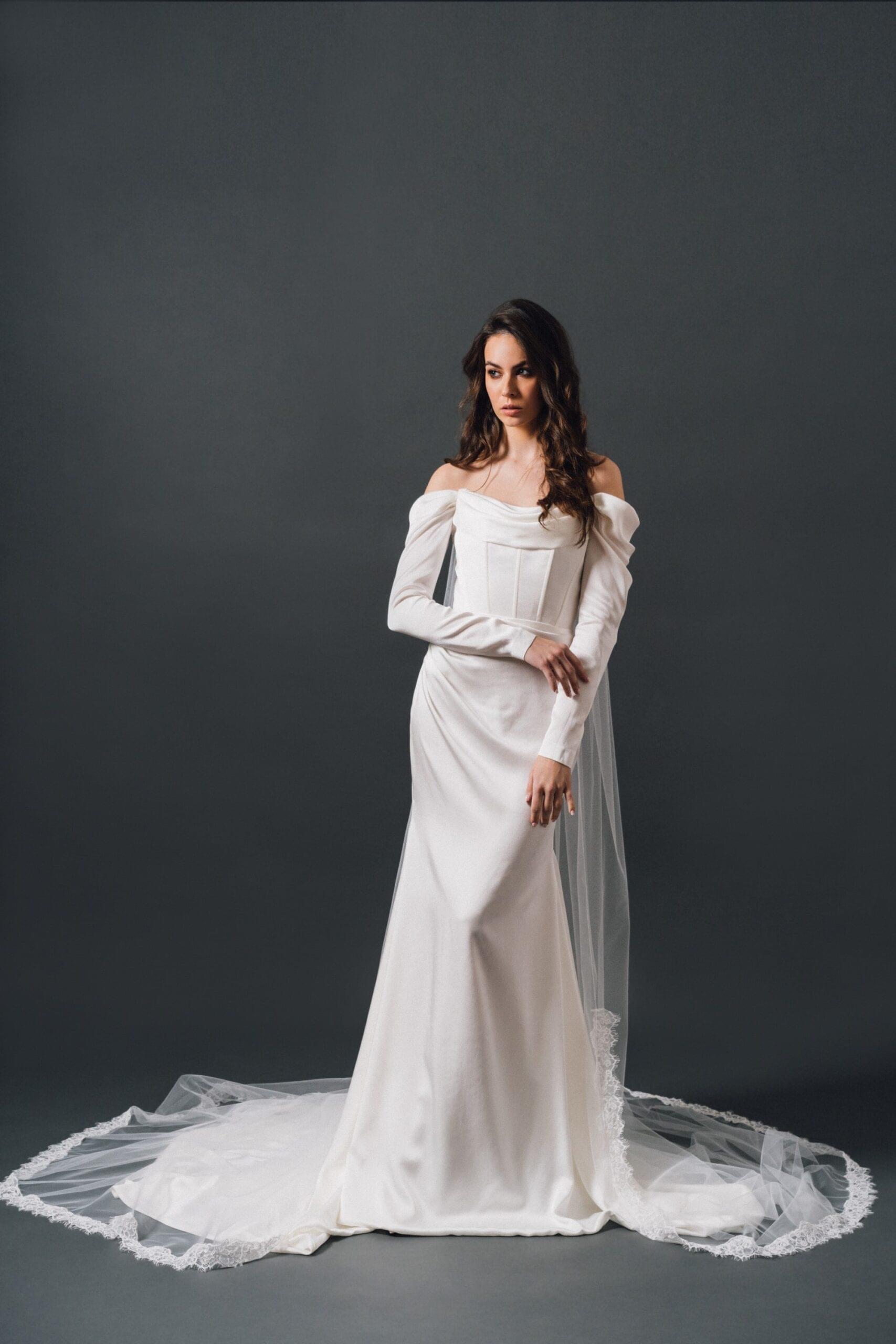 Sirena kroj i drapirani korzet vjenčanice naglašavaju ženstvenu figuru. Dugi šlep upotpunjuje bezvremenski izgled vjenčanice.